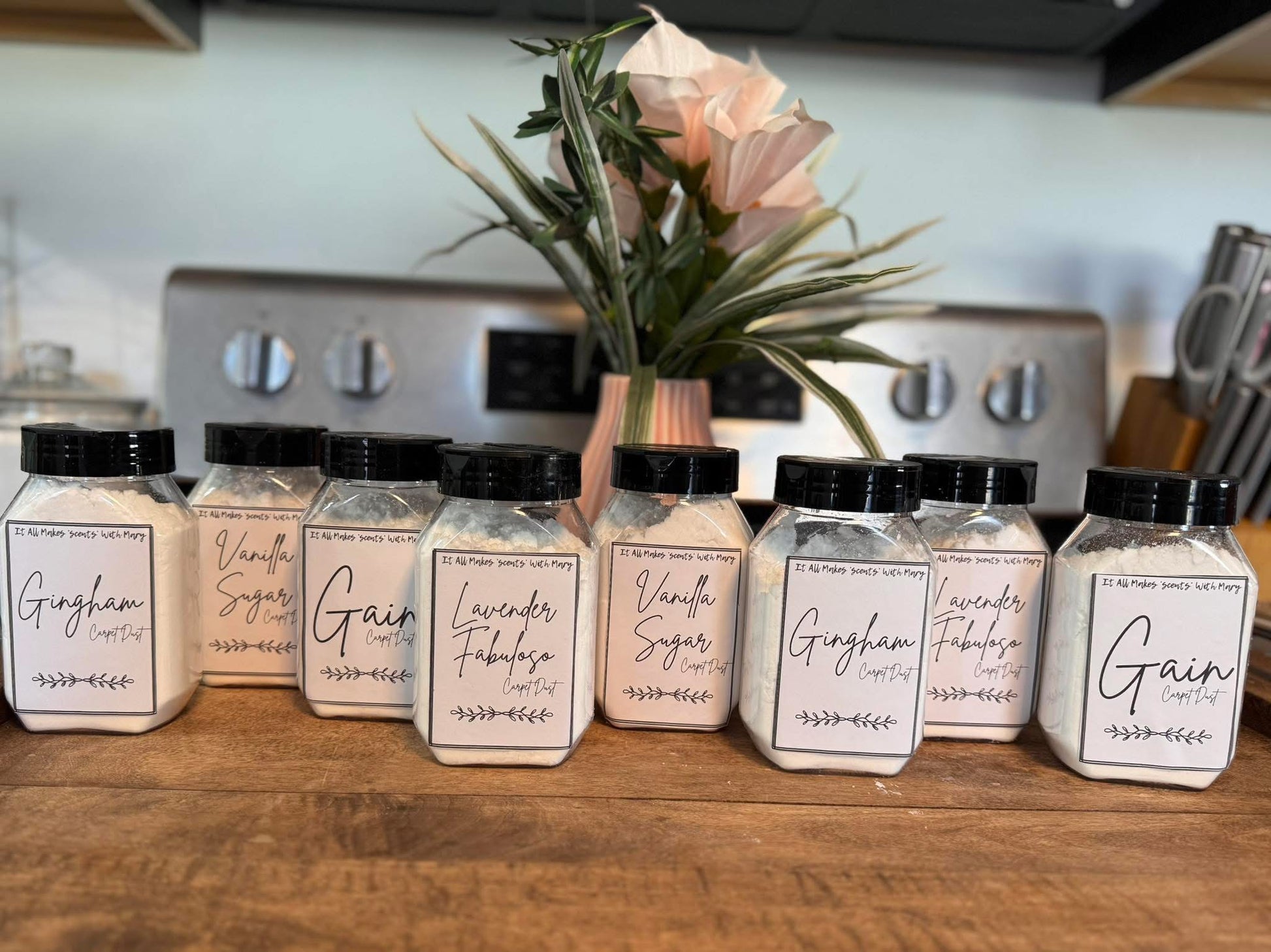 Sprinkle it on your carpets, throw rugs, the floor mats in your car, your bed, anywhere you desire! Allow the dust to sit on the carpet for 10-15 minutes, and then vacuum it up! You will be left behind with the aroma of your choosing.